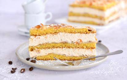 7. Ein Kuchendrittel auf eine längliche Kuchenplatte legen und mit der Hälfte der Creme bestreichen. Das zweite Drittel daraufsetzen und mit der restlichen Creme bestreichen. Mit dem letzten Kuchenstück abdecken und dieses leicht andrücken. Die Schnitten vor dem Servieren idealerweise über Nacht im Kühlschrank durchziehen lassen.