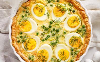 5. Erbsen auf dem Teigboden verteilen und die Eiermischung darüber gießen.