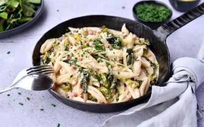 7. Nudeln mit einem Schaumlöffel aus dem Wasser heben, abtropfen lassen und gemeinsam mit etwa 100 g Bergkäse zur Sauce geben. Alles gut vermengen.