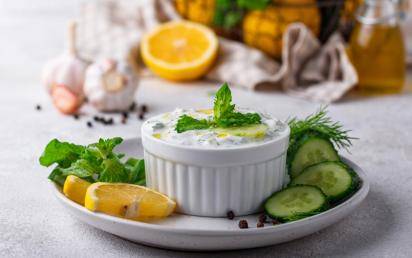 4. Gurkenraspel, Joghurt, Knoblauch, Dill, Zitronensaft und Olivenöl vermischen und das Tsatsiki mit Salz & Pfeffer abschmecken.